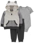 Designed with 3D ears on the hood, this jacket pairs with a short-sleeve bodysuit and a pair of easy on pants.